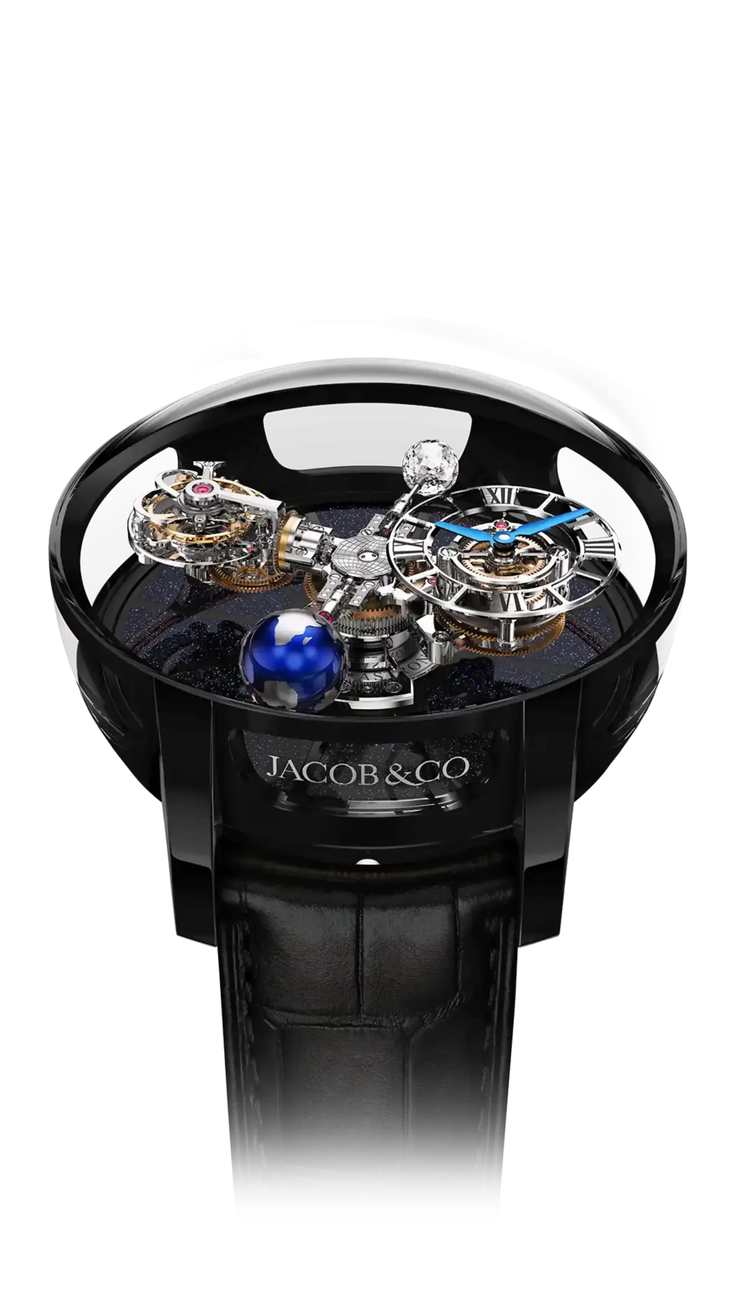 Creating a miniature, mechanical solar system required going beyond all preconceptions, innovating and breaking barriers, like space exploration. Caliber JCAM10 is one of the most advanced and complex movements in the Caliber JCAM10 is a three-dimensional movement with a central, vertical axis. It carries four satellites. All of them rotate on their individual axis, and around the central axis. A triple-axis tourbillon, a diamond moon, an Earth globe, a rotating dial, its complications take on the form of planetary bodies. Orbits are defined by their speed. The rotation of Astronomia’s central axis impacts energy management, power reserve and most of all, the impression Astronomia leaves on the viewer. The platform’s full rotation takes 20 minutes.
