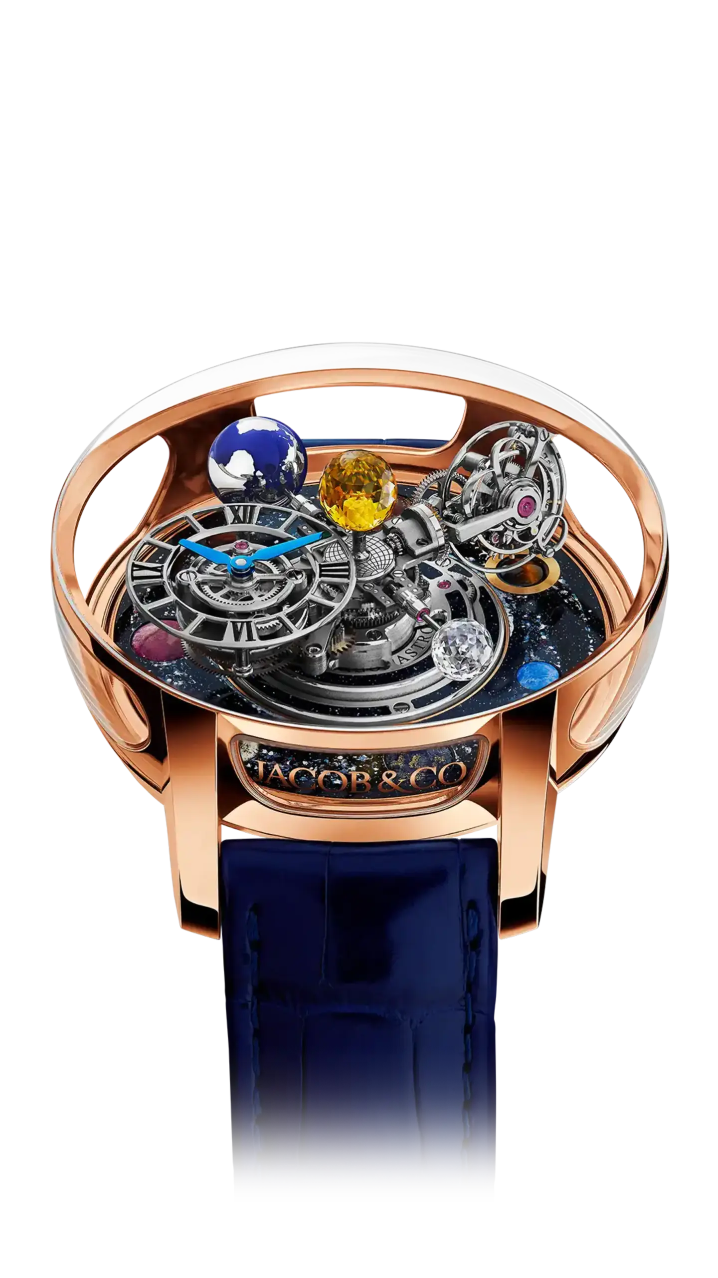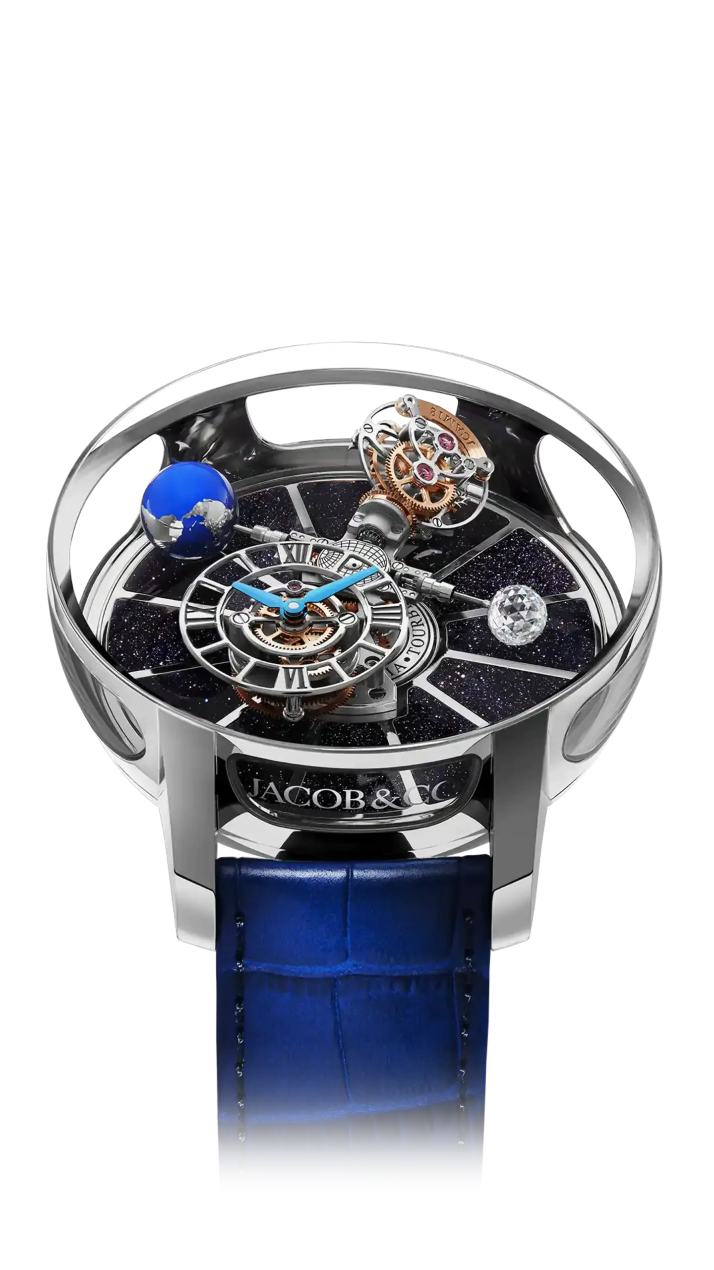 Celestial bodies and space exploration have long driven Jacob Arabo’s creativity. In 2014, he translated his intimate passion into an ambitious timepiece concept. Astronomia Tourbillon is an unheard-of translation of astrophysics into watchmaking form. It is a wrist-sized model of a planetary system and its constant motion. The Astronomia Tourbillon case is designed like an astronomer’s observatory. A vast sapphire dome on top and sapphire panels on the caseband open a galaxy-wide view. The aventurine base plate shines like a starry sky at night. A diamond-made moon and a blue lacquer earth come alive with the combination of design and horology. Astronomia Tourbillon is pure movement, at a level of complexity and beauty that makes it unique.